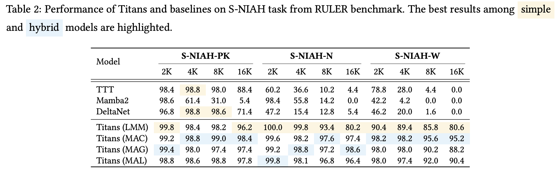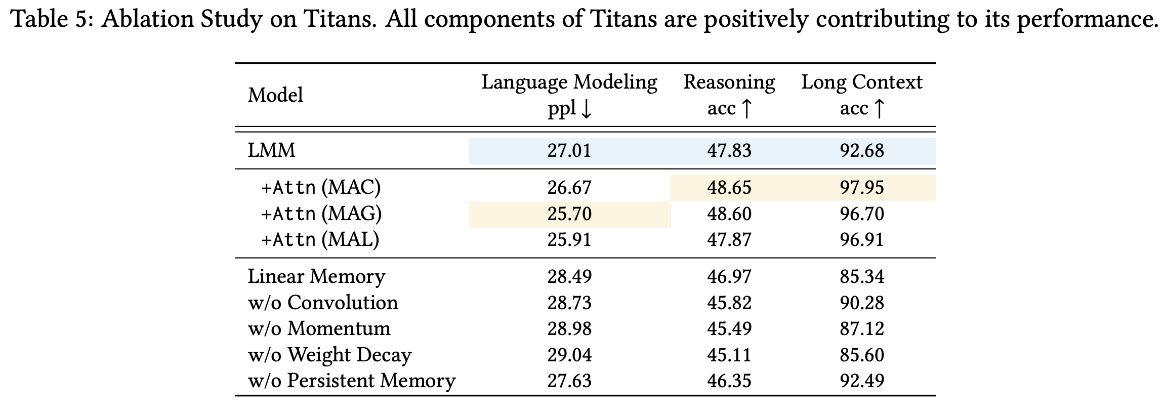MAC, MAG 방식이 MAL 방법보다 전체적인 성능이 높았고, 이에 기존 Hybrid 모델들이 대부분 MAL 방식을 따르고 있는데, Titans의 MAC, MAG 방식이 더 우수한 성능을 보인다는 것을 발견한 것이 주요한 발견이라고 논문에서는 말하고 있다.