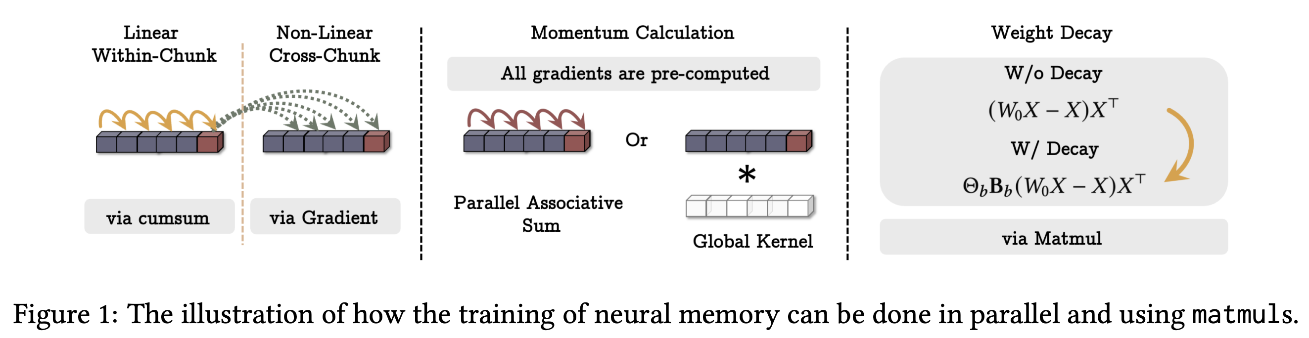 앞선 아키텍처 소개에서는 간단하게 개념을 전달하기 위해 디테일한 세부 구현 내용을 생략하였다. 따라서 논문에서는 이 섹션을 통해 Titans 모델을 효과적으로 학습시키기 위해 사용된 핵심 기술들을 소개한다.