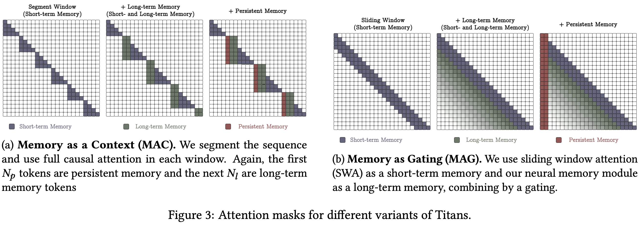 이러한 구조를 가지는 Titans 모델의 Memory 모듈을 활용하는 3가지 변형 모델 또한 같이 제안하였다.