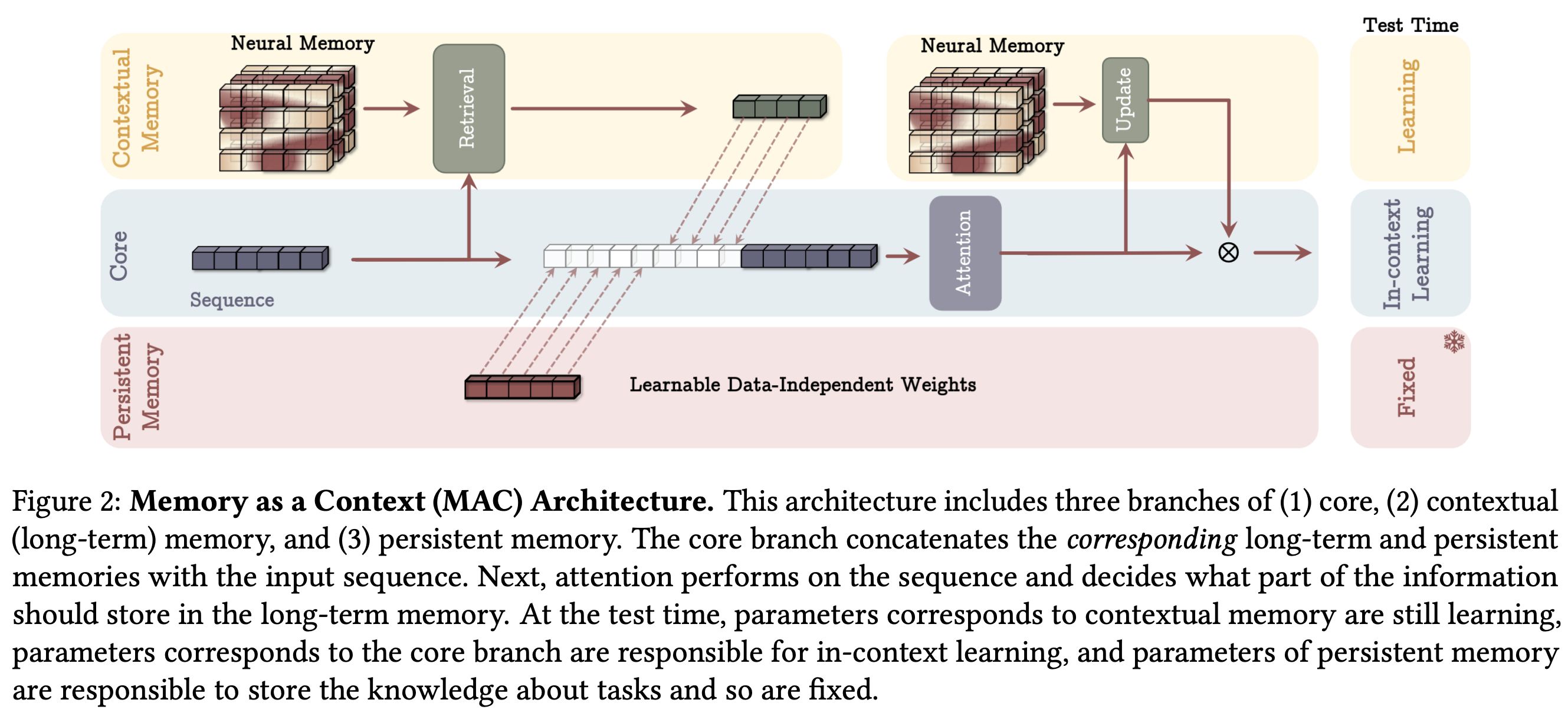 Attention은 짧은 Context 안에서는 정확한 의존성을 모델링하지만 Context의 길이가 제한되어 있기 때문에 장기 기억에 불리하다는 특징을 가지는데, 본 논문에서는 과거의 문맥 정보를 학습하여 기억할 수 있는 새로운 장기 메모리 모듈을 같이 활용하여 Attention이 현재 문맥을 집중적으로 참고하면서도 먼 과거의 정보를 활용할 수 있도록 돕는다. 이 신경망 메모리는 병렬적으로 빠르게 학습할 수 있으며, 동시에 빠른 추론 속도를 유지하는 장점이 있다.