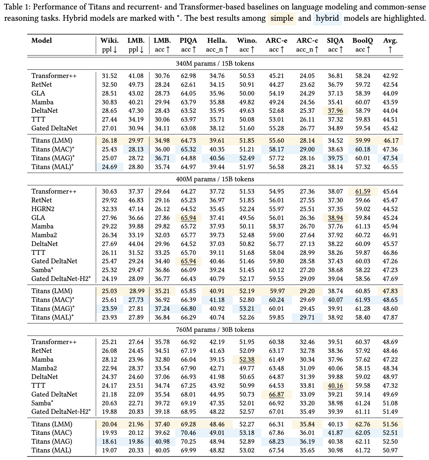 vs Mamba: Mamba, Mamba2, Gated DeltaNet도 Gating Mechanism을 사용하지만, Titans가 더 높은 성능을 기록