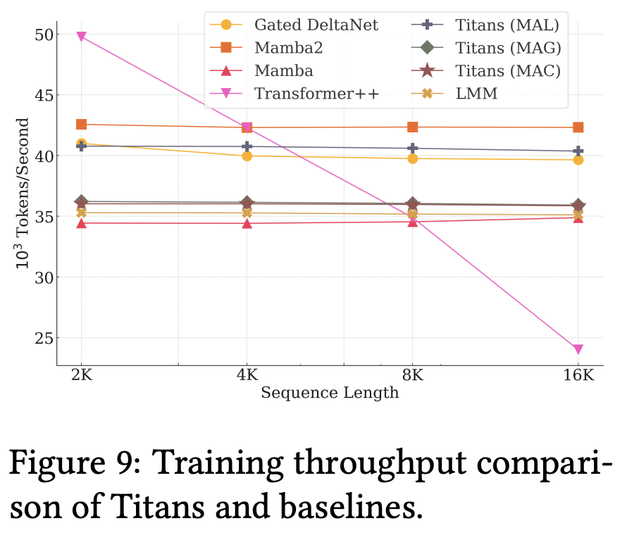학습 속도의 경우에는 MAL 모델이 Titans 모델들 중에서는 가장 빨랐다. 나머지는 조금 오래 걸림.. 가장 성능이 좋지 않았던 MAL 방식이 아무래도 기존 Hybrid 모델들과 비슷한 방법론을 차용해서이지 않을까?