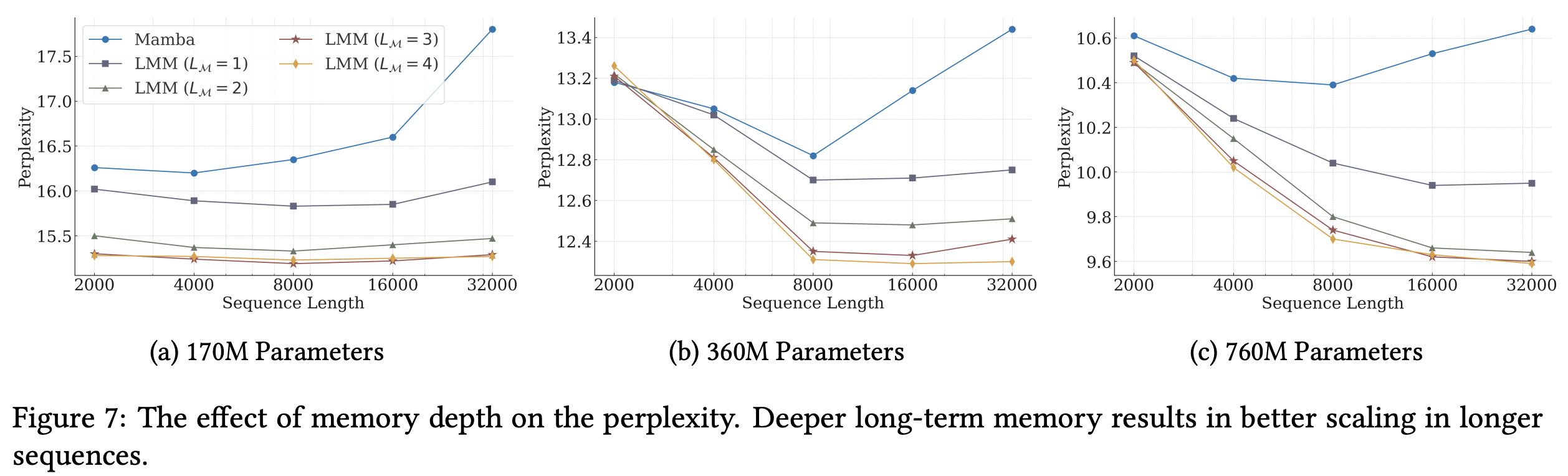 이번 섹션에서는 Neural Memory의 깊이가 모델 성능과 학습 속도에 미치는 영향을 평가한다. Neural Memory 모듈의 깊이를 1~4로 변경하면서 실험을 진행하였으며, 깊은 Memory일 수록 성능이 증가하는 것을 확인하였다.
