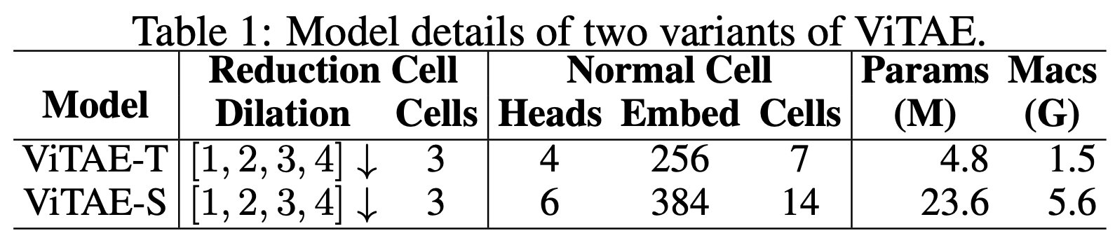 실험에 사용한 ViTAE 모델의 구성은 Table 1과 같다. 구체적인 내용은 논문을 참고.