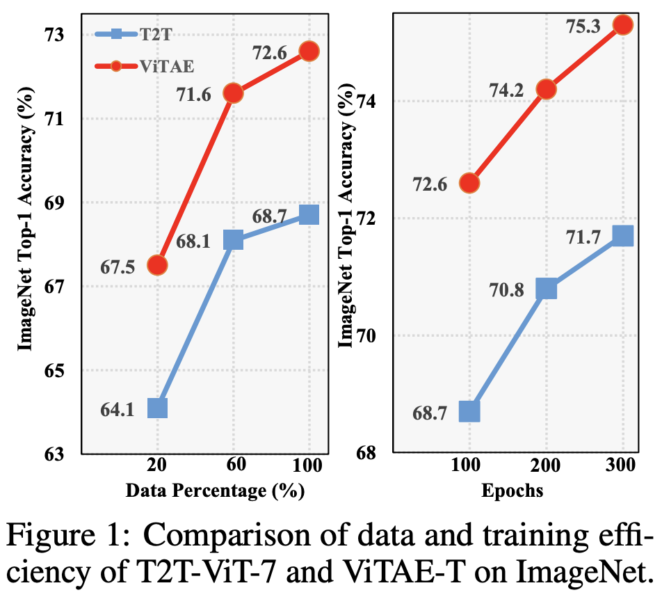 데이터 양을 다르게 한 실험(ImageNet 데이터 20%/60%/100%)과 Epoch 수를 다르게 한 실험(100/200/300)을 수행하였고, 모든 실험 조건에서 T2T-ViT 모델보다 좋은 성능을 보였다.