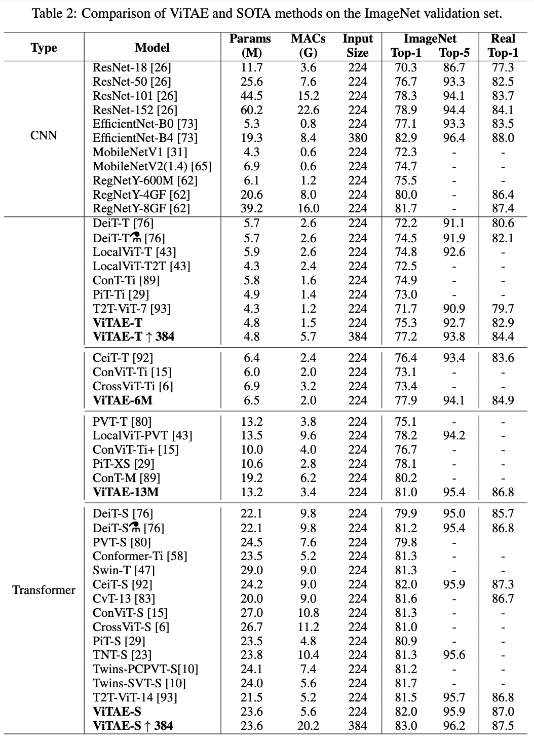 ViTAE-S: ResNet-101/152보다 파라미터 수는 절반이지만 정확도는 비슷. 입력 해상도를 키울경우 SOTA와 대등