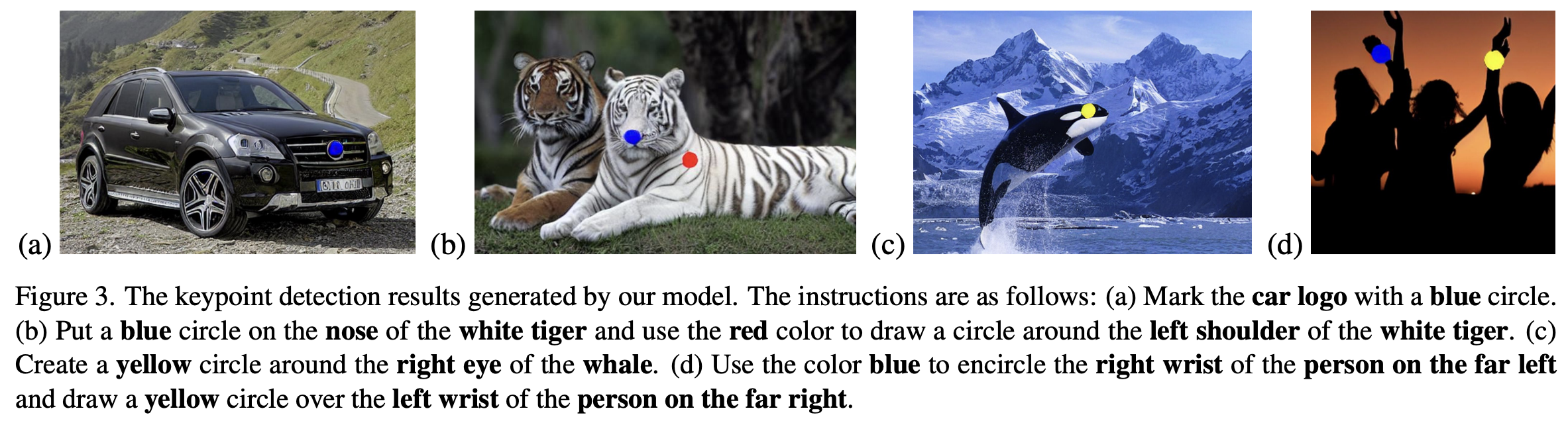 Keypoint Detection의 목적은 이미지 속에서 특정 객체의 구성 요소를 정확히 찾는 것이다. 기존에는 각 Keypoint에 2D Gaussian Heatmap을 덧씌우는 Heatmap Regression 방식이 주로 사용되었지만, 본 논문에서는 "남자의 왼쪽 어깨를 빨간색으로 동그랗게 칠해주세요"와 같은 직관적이고 상세한 지시어를 제공함으로써 출력 이미지에 Keypoint 검출 결과를 시각화해준다.