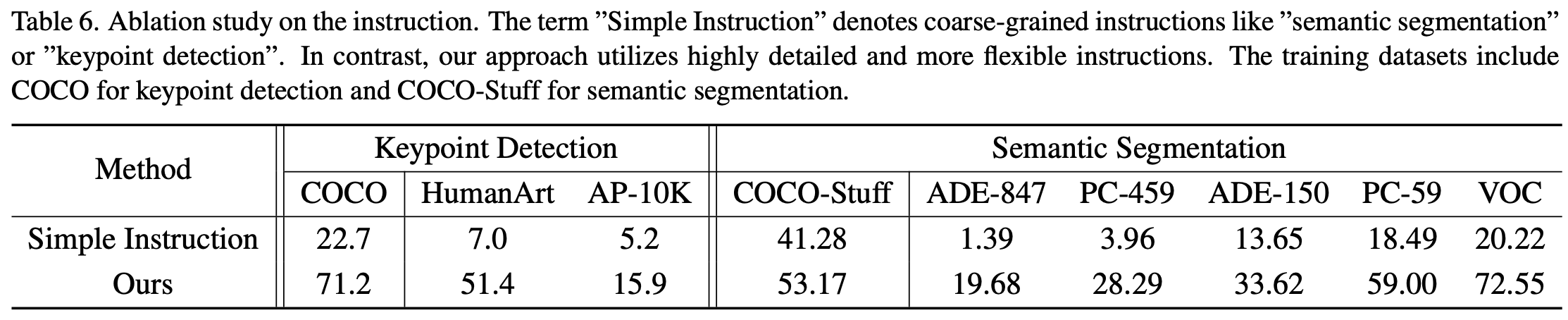 소제목 그대로 디테일한 지시어를 사용하였을 때 성능이 얼마나 좋아지는지를 실험한다. 기존 모델들은 자연어 Instruction을 단순히 Task Indicator로 취급하지만, InstructDiffusion에서는 훨씬 더 구체적이고 풍부한 설명을 포함한 Instruction를 사용한다. 이를 확인하기 위해 Instruction을 "Semantic Segmentation", "Keypoint Detection"과 같이 단순한 형태로 만들어 실험하였다.