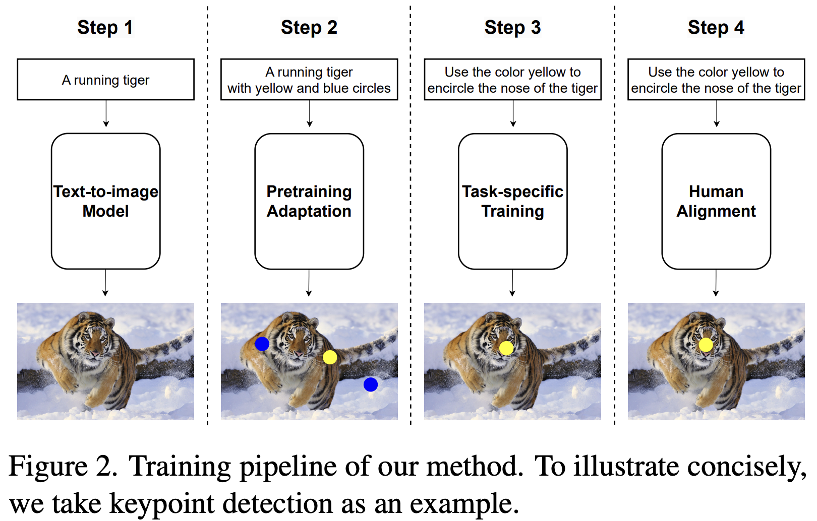 이를 위해 기존 Segmentation, Keypoint Detection 데이터 셋을 활용하여 Mask가 포함된 이미지나 특정 표시가 있는 이미지를 생성하여 Diffusion Output Distribution을 조정하였다. 그리고는 본래 존재하는 이미지 캡션에 접미사로 "여기저기 색깔 패치가 조금 있는 이미지", "빨간 원으로 둘러싸인 이미지"와 같은 텍스트를 추가해 Diffusion 모델을 Fine-tuning하였다.