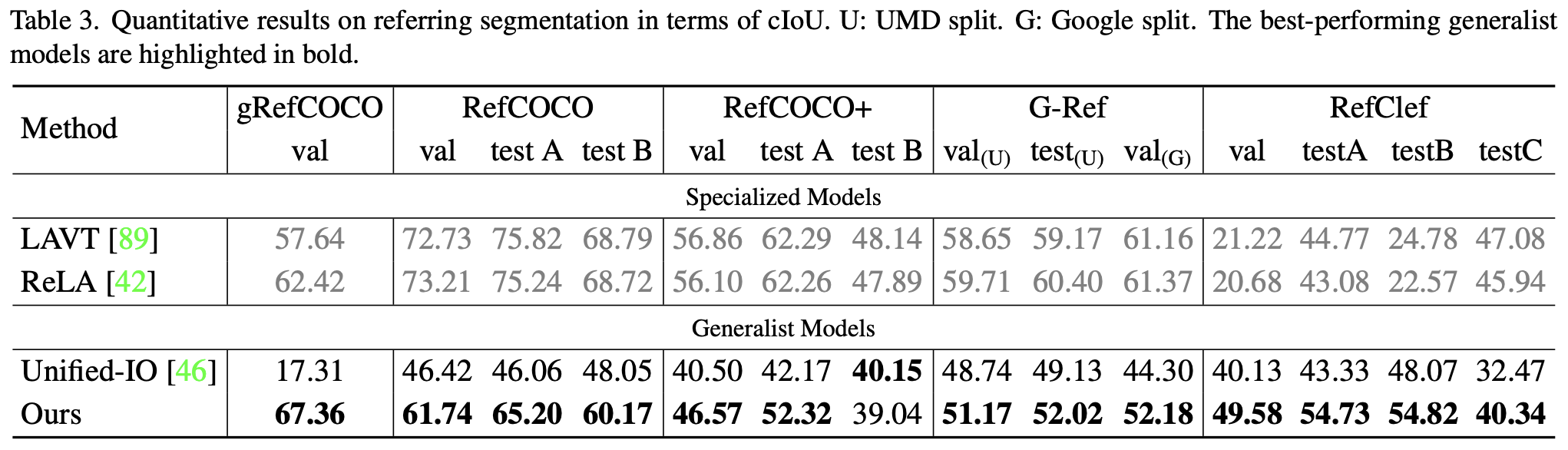 Table 3은 Referring Segmentation 실험에 대한 결과가 나타나 있다. Unified-IO 모델은 지금까지 유일하게 존재하는 Referring Segmentation을 지원하는 Generalist 모델이며, 대부분의 데이터 셋에서 InstructDiffusion 모델이 Unified-IO의 성능을 월등히 능가하였다.