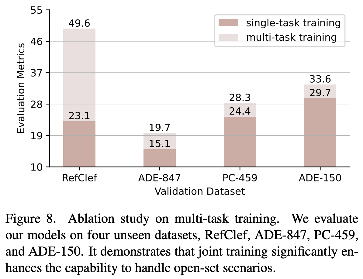 이 Section에서는 특히 Open-Vocabulary 상황에서의 모델 성능을 평가하는데 집중하였다(아무래도 Keypoint는 Open Vocabulary가 어려우니까 Segmentation에서 주목한 듯). 즉, 학습에 사용하지 않은 클래스가 포함된 이미지에 대해 얼마나 잘 일반화할 수 있는지를 분석한 것!