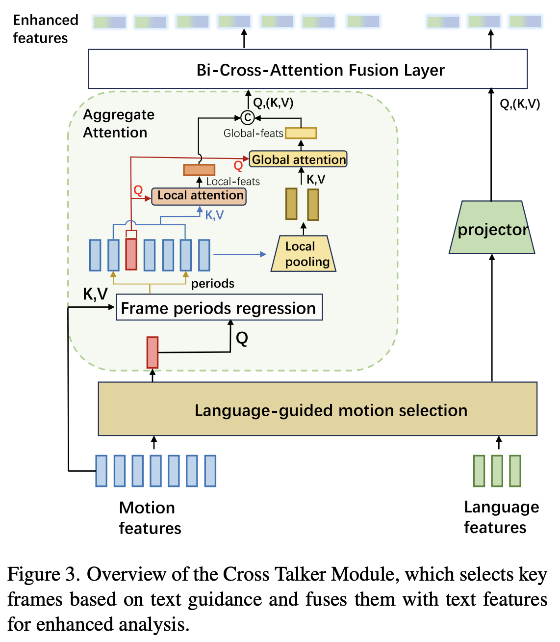 - Cross Talker 모듈: 강화된 Motion Feature를 Text 지침에 따라 집계하고, Text와 같은 의미 공간에 정렬시켜 LLM이 사용할 수 있도록 변환