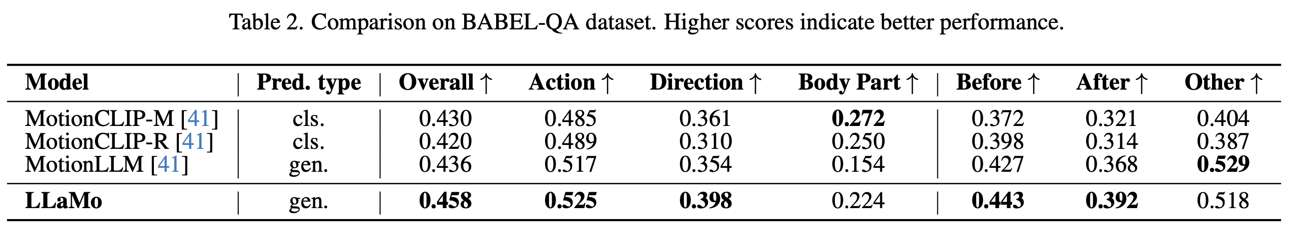 복잡한 모션 기반 질의응답 성능을 평가하는 데이터셋인 BABEL-QA을 가지고 한 평가에서도 LLaMo는 좋은 성능을 보였다.