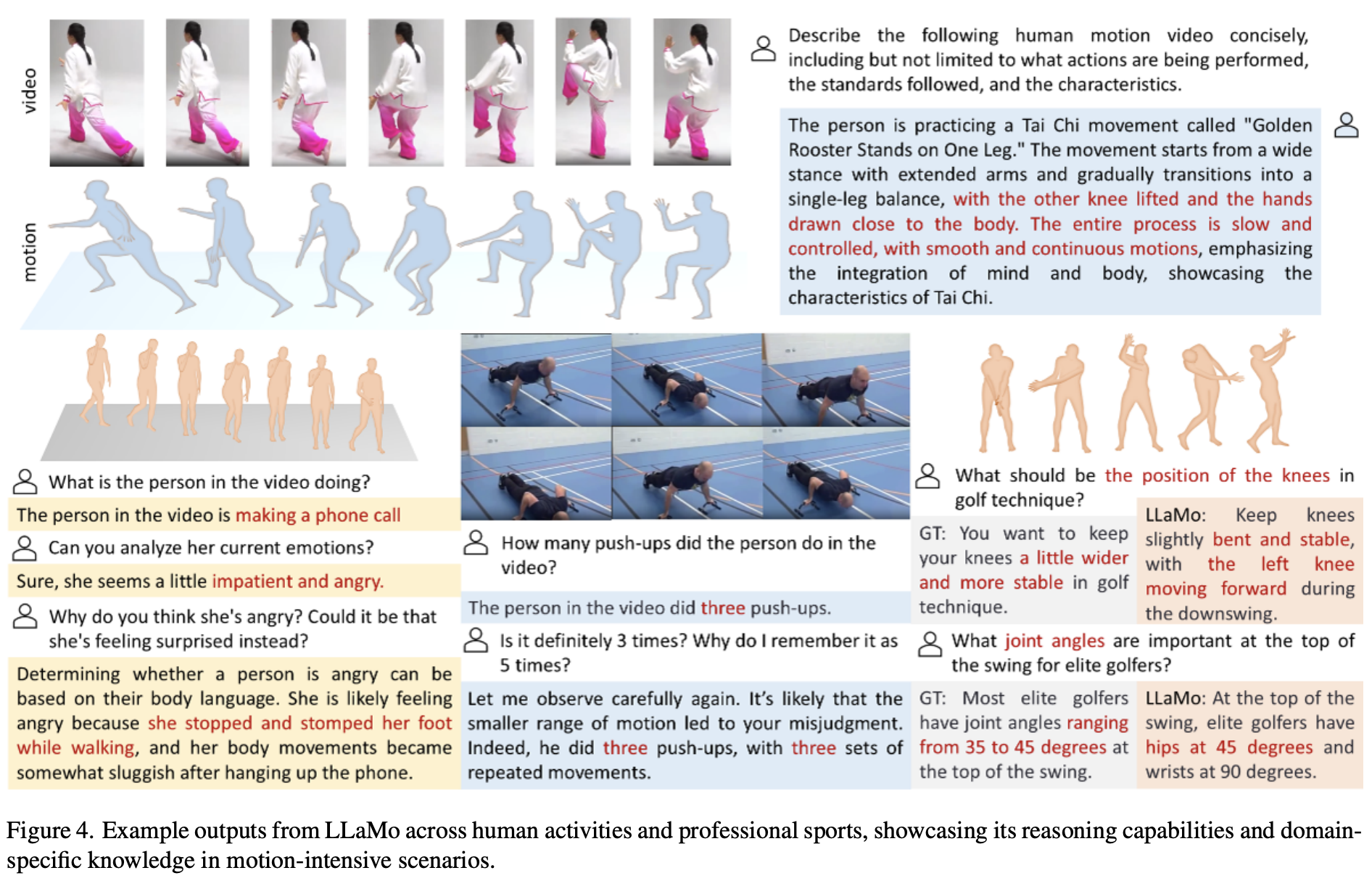 본 논문에서는 Motion 데이터를 LLM에 직접 통합하여 멀티모달 이해 능력을 향상시킨 LLaMo 모델을 제안한다. LLaMo는 텍스트, 비디오, 모션 데이터를 하나의 통합 구조 안에서 결합한 아키텍처로 설계되었으며, 그 결과 세밀한 모션 디테일을 포착할 수 있었으며, 전문 스포츠 분석과 같이 복잡한 인간 행동을 정확하게 해석할 수 있었다.