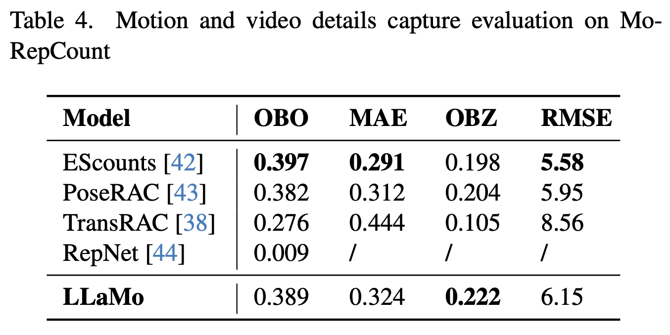 Mo-RepCount 데이터 셋을 활용한 실험에서도 LLaMo가 좋은 성능을 보였다.
