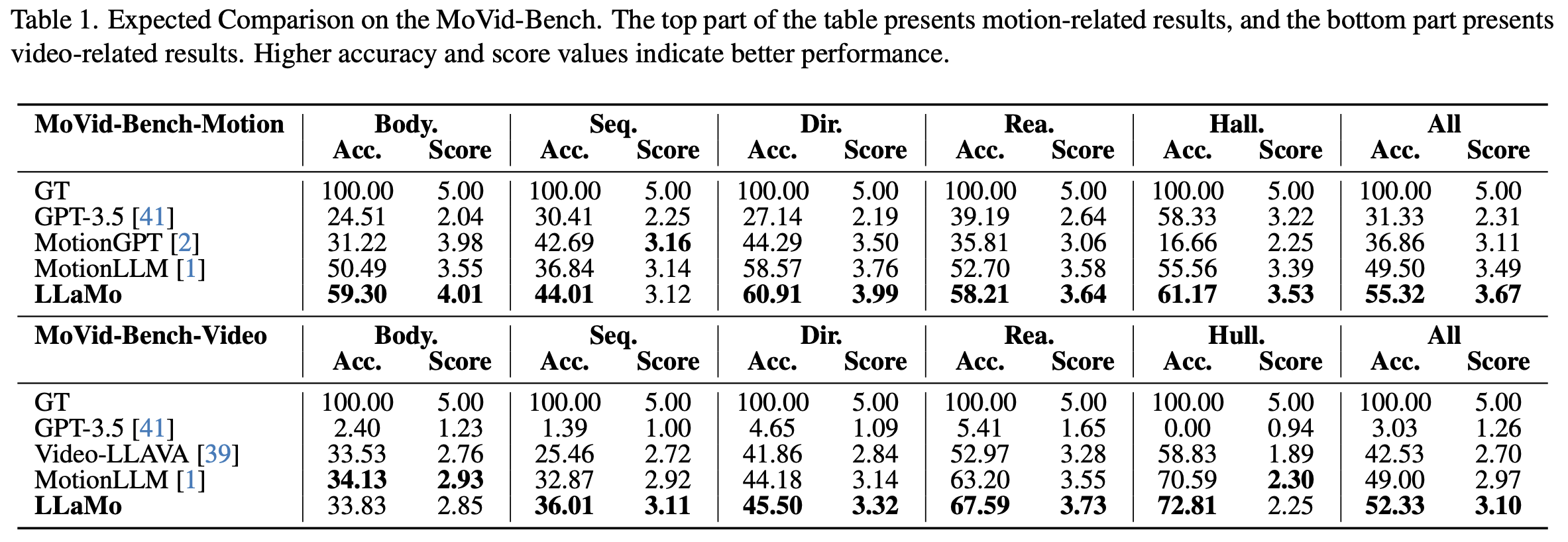 - Table 1을 보면, MotionLLM이 일부 신체 부위 인식에서 LLaMo보다 앞섰지만, LLaMo는 추론 능력, 총점에서 더 뛰어나다.