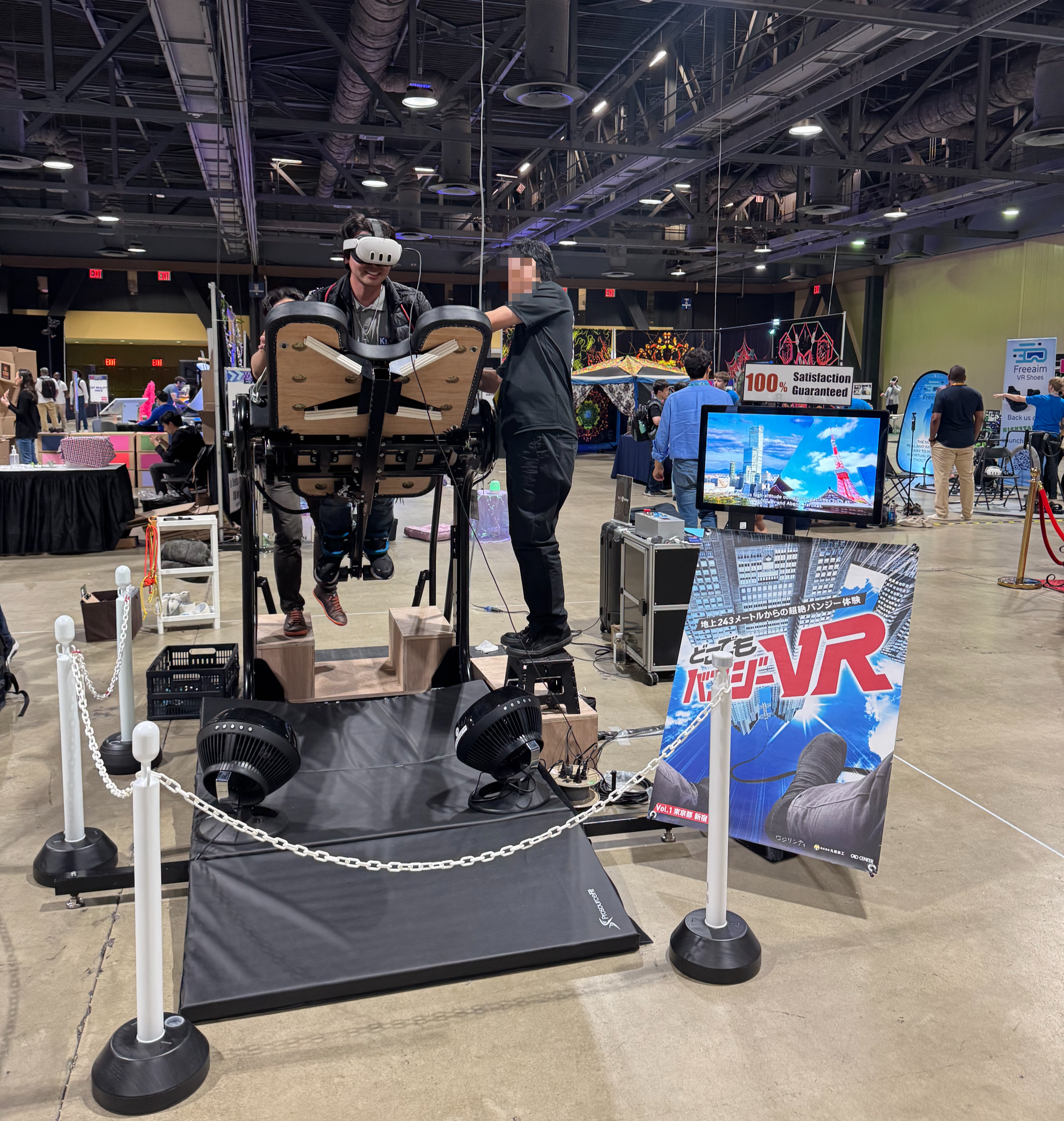 가장 기억에 남는 부스는 VR 번지점프 부스였다. 일본의 한 기업의 제품으로 전시 첫날부터 많은 사람들이 체험해보고 싶어 줄이 길다는 소문이 자자하였었는데, 셋째날 우리 부스 세팅을 마무리 하고 시작시간이 되자마자 바로 줄을 서 체험해볼 수 있었다. 번지점프를 해보지 않은 나로서는 이 체험이 어떨지 정말 궁금하였는데, 직접 해보고 나니 너무 재밌었고 실제 번지점프를 하는 것처럼 바람을 쐬고 기기가 움직여 소리를 지르지 않을 수가 없었다. 일본에서 이미 몇몇 곳에 기기를 납품하셨다고 하는데 좋은 상품이니만큼 하시는 사업이 잘 되시기를 바란다 :)