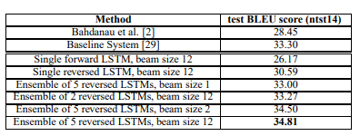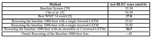- 마지막으로 LSTM을 사용하여 공개적으로 사용가능한 1000개의 SMT baseline을 재채점 하여 36.5라는 BLEU 점수를 얻었다.