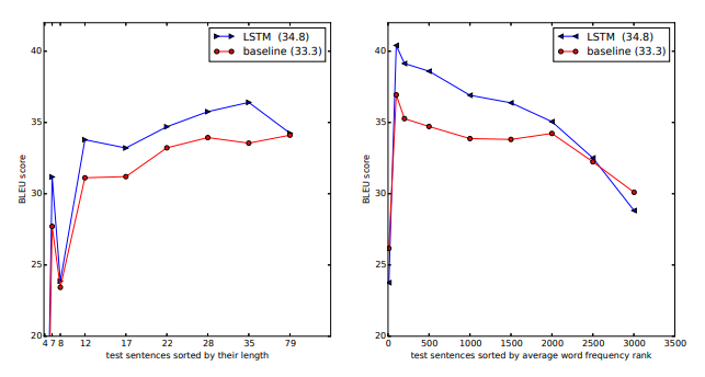 - LSTM의 놀라운 점은 매우 긴 문장에도 어려움을 겪지 않는다는 것이다. training과 test set에서 target sentence가 아닌 source sentence의 단어 순서만 뒤집었기 때문에 긴 문장에서도 좋은 성능을 낼 수 있었다. (많은 단기 종속성을 도입할 수 있기 때문)