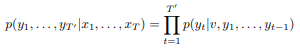 - 위의 방정식에서 $P(y_t|v, y_1, ... , y_{t-1})$의 분포는 모든 단어의 softmax로 표현된다.