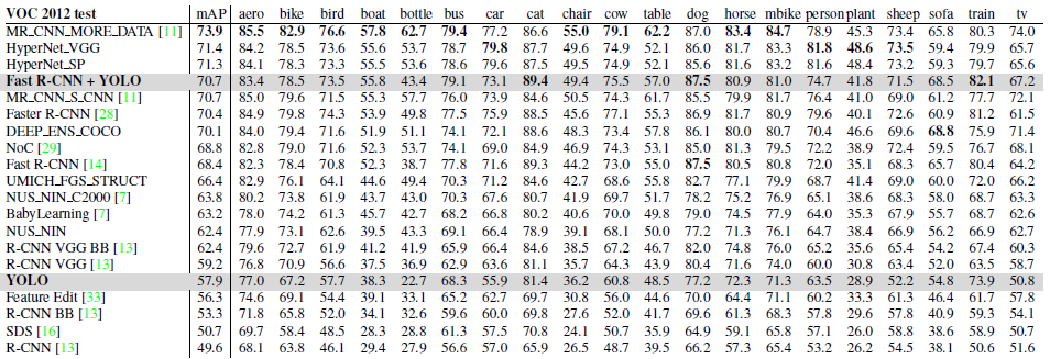 - PASCAL VOC 2012 데이터를 사용한 모델 중 속도면에서는 YOLO가 가장 빠르고, Fast R-CNN과 YOLO를 결합한 모델이 mAP는 더 좋음