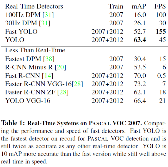 - 다른 Real-Time Detector 모델들 보다 높은 mAP점수를 기록, Fast YOLO는 가장 빠른 FPS를 기록하였다