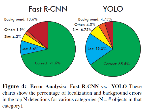 - YOLO는 localize error가 높고 Fast R-CNN은 background error가 높음 ( YOLO는 전체 이미지를 보기 때문에 background error가 낮고, 큰 bounding box와 작은 bounding box의 loss에 동일한 가중치를 두기 때문에 localize error가 높음 )
