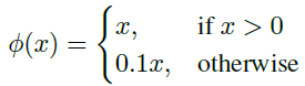 - 마지막 layer는 class probability와 bounding box 좌표를 모두 예측하는데, 이 때 bounding box의 좌표에 존재하는 x, y, w, h 값을 모두 0 ~ 1 사이의 값으로 정규화하였다. 또한 마지막 layer에는 선형 활성화 함수를 사용했고 다른 모든 layer에는 아래 식과 같은 leaky ReLU를 사용하였다.