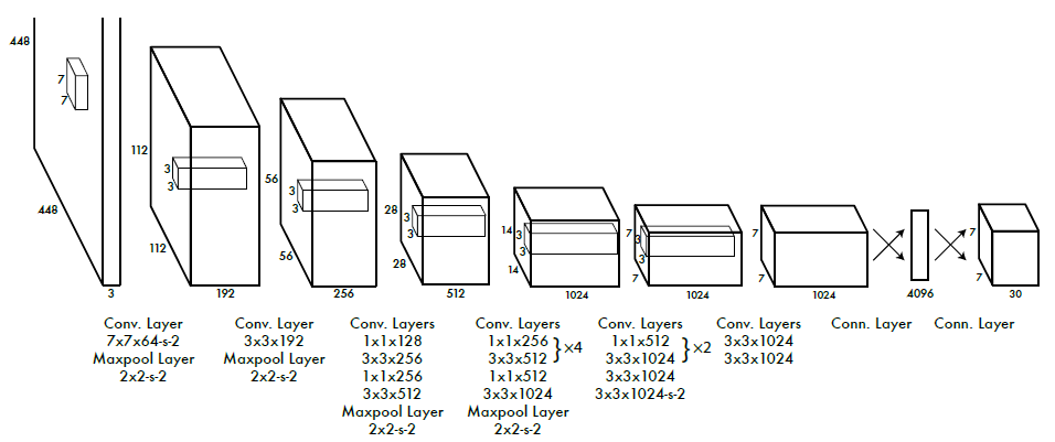 - GoogleLeNet 모델에서 영감을 받았고, 24개의 Convolution layer, 2개의 fully connected layer가 존재한다. GoogleLeNet에서 사용되는 Inception 구조 대신 1 x 1 reduction layer과 3 x 3 convolution layer를 결합하여 사용하였다.